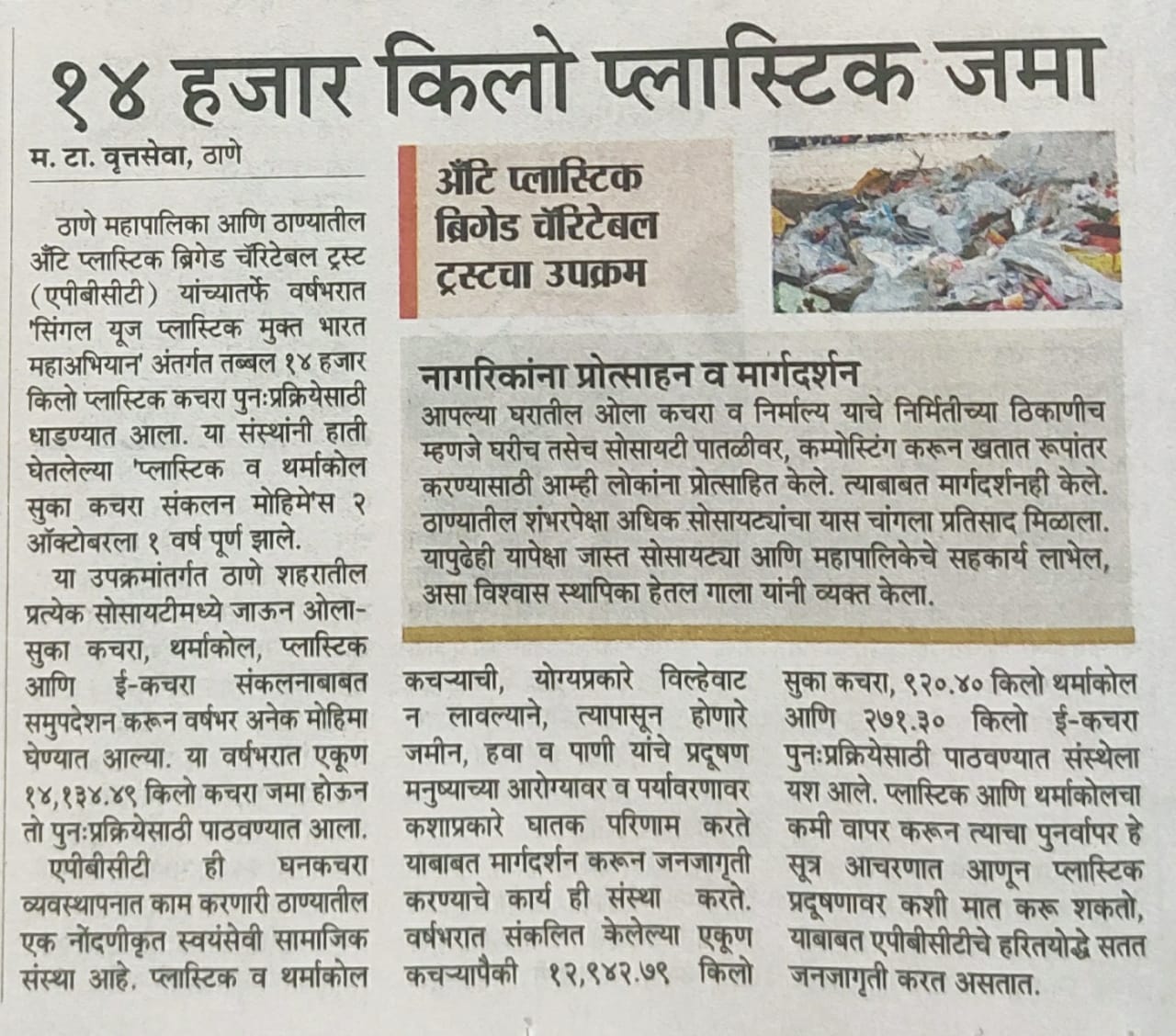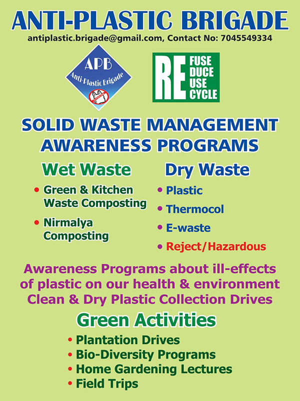 Anti Plastic Brigade charitable trust is a registered Non Govermental Organzation from the city of Thane working mainly for Solid Waste Management along with other Green Activities since 2017.