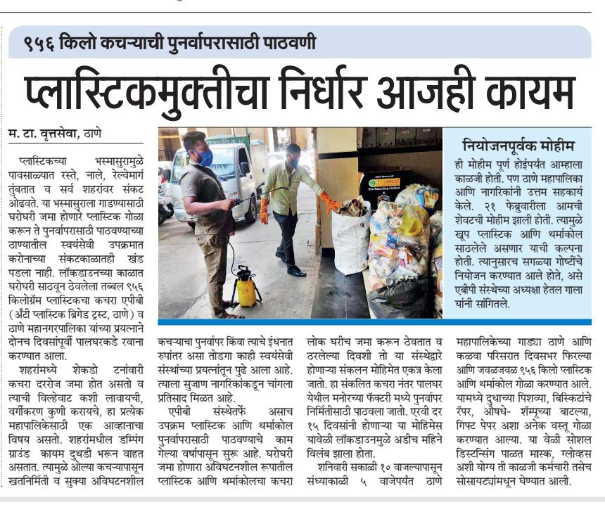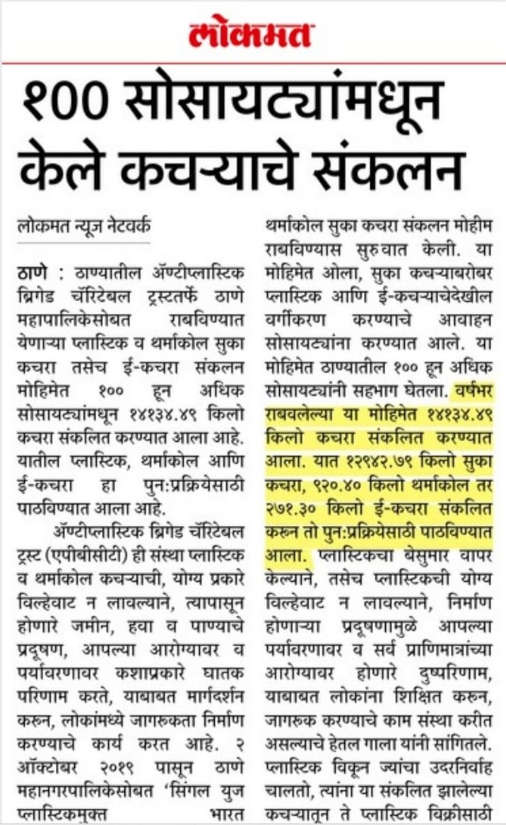 Anti Plastic Brigade Charitable Trust and its Green Brigadiers were appreciated for their tireless efforts in SWM & convincing people about importance of RECYCLING. In June 2020 they were awarded with certificate of appreciation as TMC secured 1st position in 'MAJHI VASUNDHARA ABHIYAN 2020-21' in MAHARASHTRA